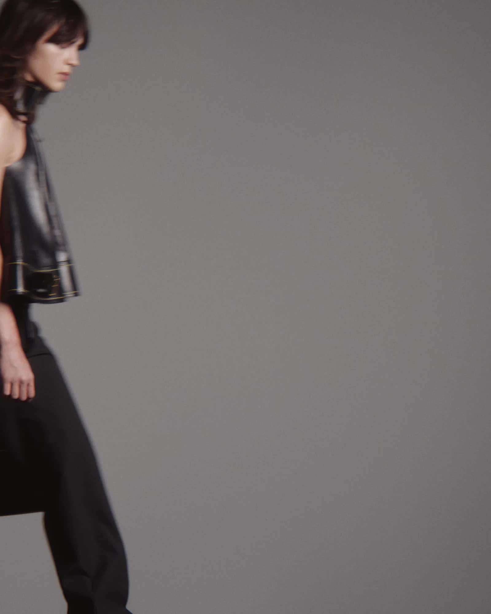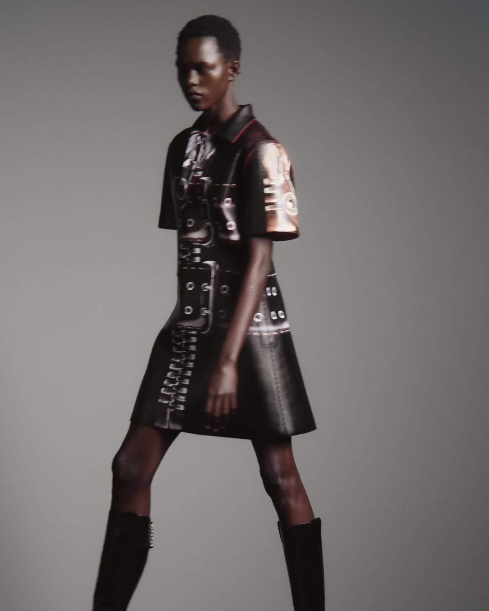 Zooming in on elements of a woman’s wardrobe, proportions and scales are reinvented, creating silhouettes where the details reign over. Belts printed using a 3D effect take on a trompe l’oeil effect, while folds of a kilt are enlarged and become flat pleated dresses, adding a playful and unique aspect. Nicolas Ghesquière also uses embroidery that simulates a macro tweed, created using a 3D scanner and blowing up each image to highlight every thread and its texture. Using emphasis as a figure of style, a selection of bags take on disproportionate details, while others are recreated with dramatic proportions.
