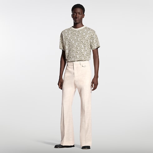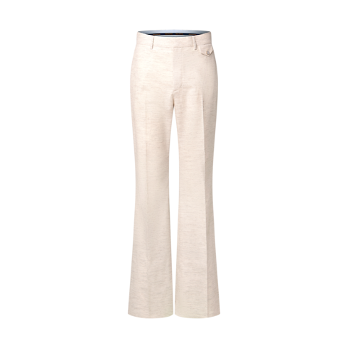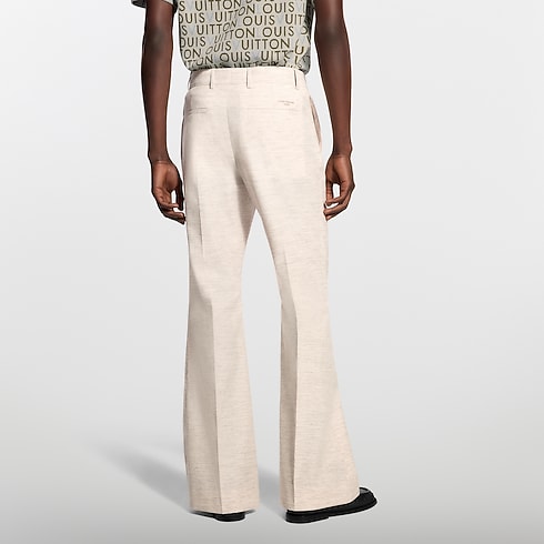 These chic flared pants draw on the subtle textures and tonalities of the Spring-Summer 2026 show’s Indian inspiration. They are tailored from pale beige wool-cotton with a subtle grained and flecked weave, while Louis Vuitton Paris lettering is discreetly embroidered above a rear pocket. A matching double-breasted jacket makes a sharp suit that anticipates spring.