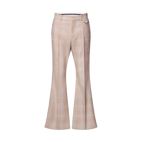 These flared pants from the Spring-Summer 2026 runway exemplify this season’s Indian Dandy aesthetic. Tailored from a fine wool glen check in elegant camel tones, they are adorned with embroidered beads resembling jewelry along the outer seam of each leg, while tone-on-tone Louis Vuitton Paris lettering discreetly signs the back. A matching jacket makes a standout suit.