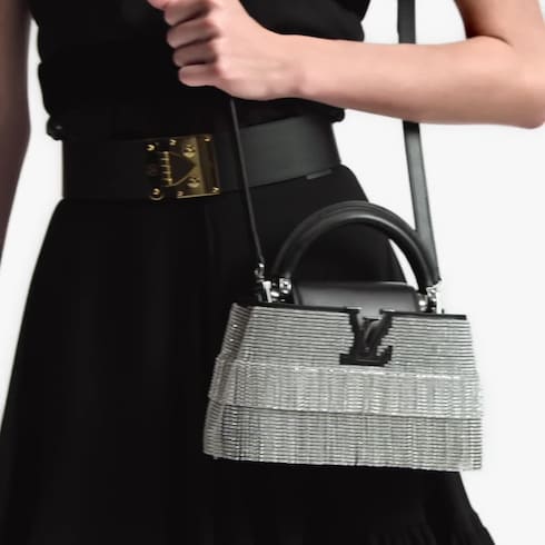 The Exceptionals LV Sparkle collection part of the Spring/Summer 2025, introduces this exquisite version of the Capucines East-West Mini. It is adorned with shimmering hand-cut crystal chains that have been stitched one by one onto the calfskin base. The perfect evening handbag, it can be worn with the flap on the inside or outside, and offers a removable strap for styling versatility. The LV Initials pay tribute to the House’s iconic legacy.