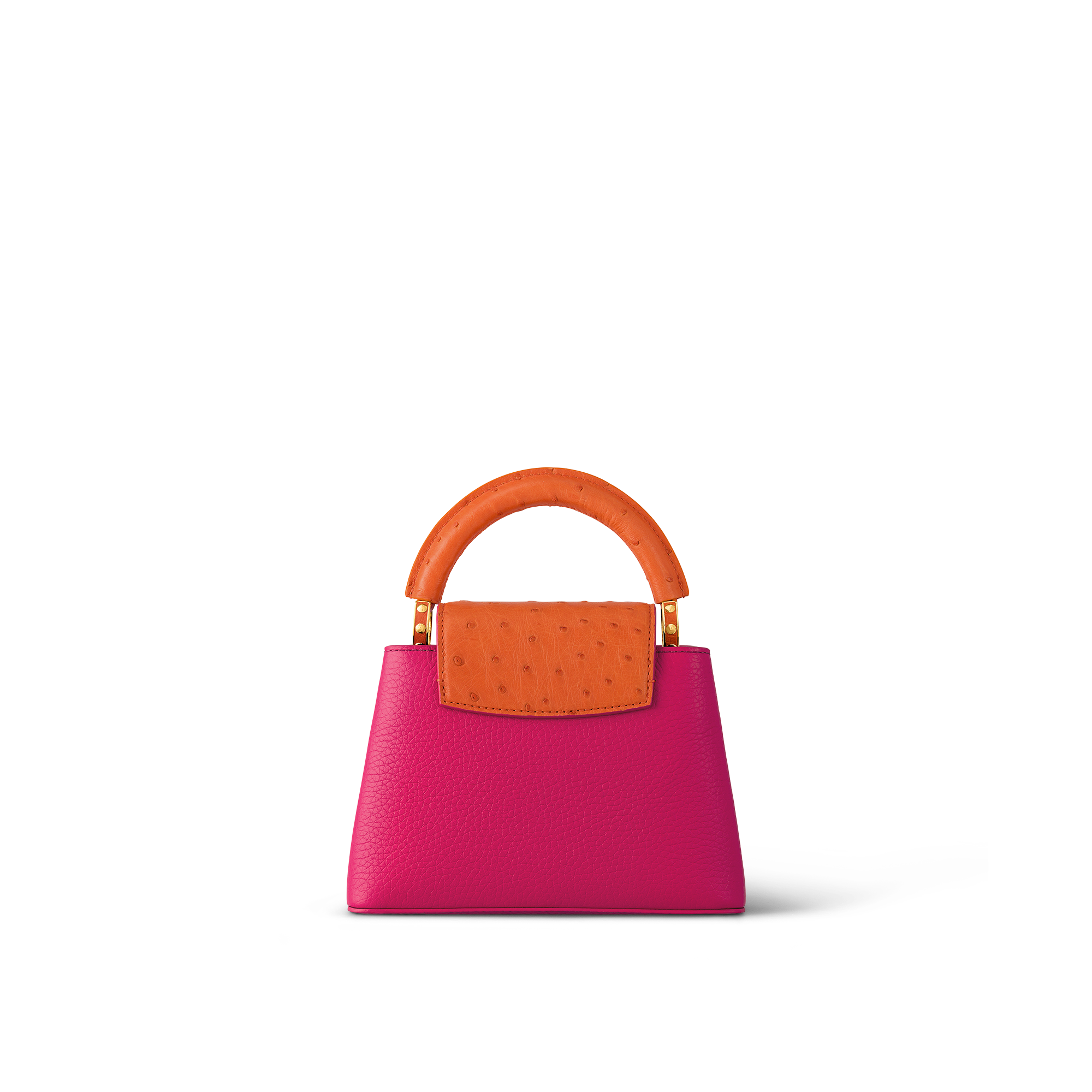 This Capucines Mini handbag is fashioned from Taurillon leather in bold fuchsia with bright-orange ostrich leather on the flap and top handle. It comes with a wide removable strap that adjusts for comfortable shoulder carry. The flap can be tucked inside to display the LV signature or worn outside to reveal a Monogram Flower.