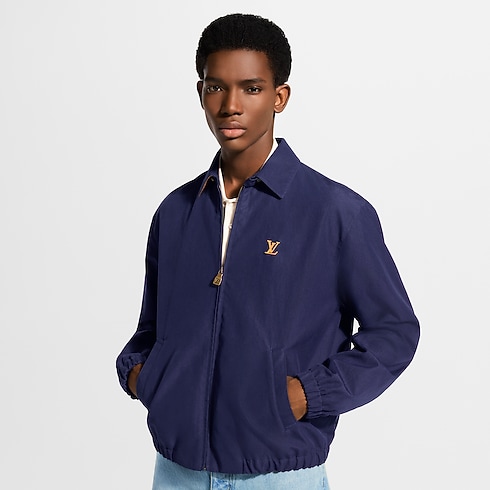 The timeless silhouette of this dark blue coach jacket is crafted from a blend of cotton, wool and silk. A VVN leather-inspired LV patch adorns the chest in homage to the House’s leather goods heritage. Mini Monogram-embossed suede leather accents the underside of the collar, while a Monogram motif embellishes the lining. Matching shorts make a smart set.