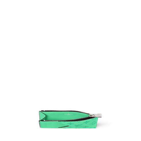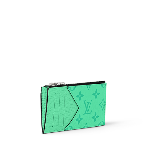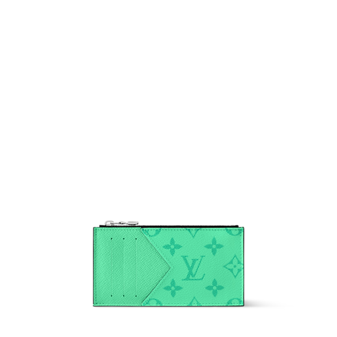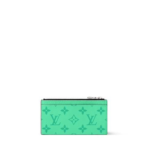 The Coin Card Holder is crafted from colored Monogram coated canvas and matching Taigarama cowhide leather. A distinctive V-shaped card slot marks the transition from canvas to leather. Inside, four card slots, a zipped pocket for coins, and a flat compartment for bills or receipts offer refined functionality.
