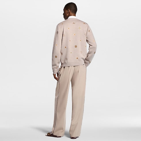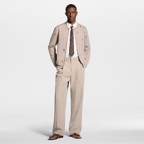 This collarless beige cardigan brings a soft signature accent to spring looks. It is adorned with a jacquard LV Flowers motif in delicate tones, with Monogram-inspired blossoms interspersed with LV signatures, while pearly buttons add a Dandy accent. This light wool-cotton knit adds a distinguished twist to this collection’s subtle hues, layering effortless elegance into an ensemble.