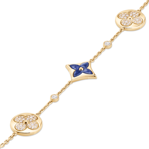 The Color Blossom pieces celebrate the emblematic Monogram Flower, designed in 1896 by Georges-Louis Vuitton, son of the founder. Set into 18-karat (750/1000) yellow gold, this precious bracelet features Star and Sun motifs carved from Sodalite, hand-polished to a high gloss and accented by brilliant round-cut diamonds. Months of work were necessary to perfect the stones’ subtle curves and sparkle. This delicate bracelet is an invitation to stack, mix or match with other models from the collection.