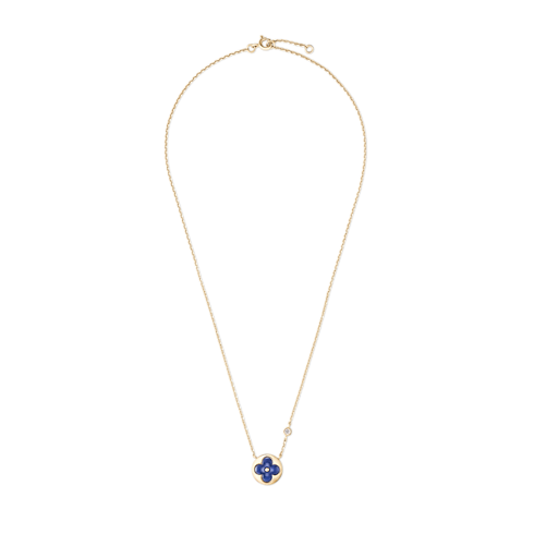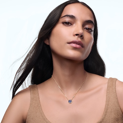 The Color Blossom pieces celebrate the emblematic Monogram Flower, designed in 1896 by Georges-Louis Vuitton, son of the founder. Set into 18-karat (750/1000) yellow gold, this precious pendant features a Sun motif carved from sodalite, hand-polished to a high gloss and accented by a brilliant round-cut diamond on the chain. Months of work were necessary to perfect the stone’s subtle curves and sparkle. This delicate pendant is an invitation to stack, mix or match with other models from the collection.