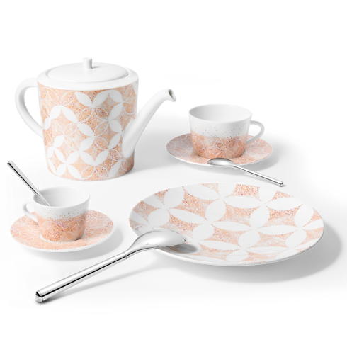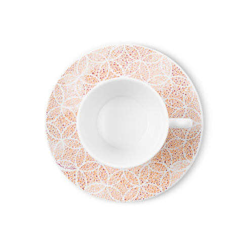 Created to accompany the other pieces from the same series, this set of two coffee cups and saucers combines flawless craftsmanship with an original Louis Vuitton signature. The Constellation pattern, an intricate composition of Monogram Flowers and Diamonds, creates an interplay of highlights, evoking the beauty of a starry night. Made of fine extra-white porcelain, these refined cups and saucers give morning or after-dessert coffee a cheerful infusion of elegance.