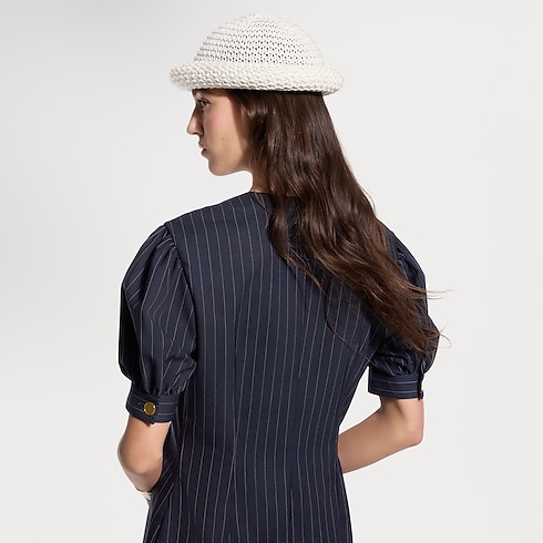 This directional dress from the Nautical collection nods to timeless tailoring codes in pinstriped wool. The fitted mid-length silhouette is defined with voluminous puff sleeves and a sweeping cut-out at the front of the hemline, while the chest is highlighted with a contrasting cotton poplin bib detailed with layered button tabs for a graphic look.