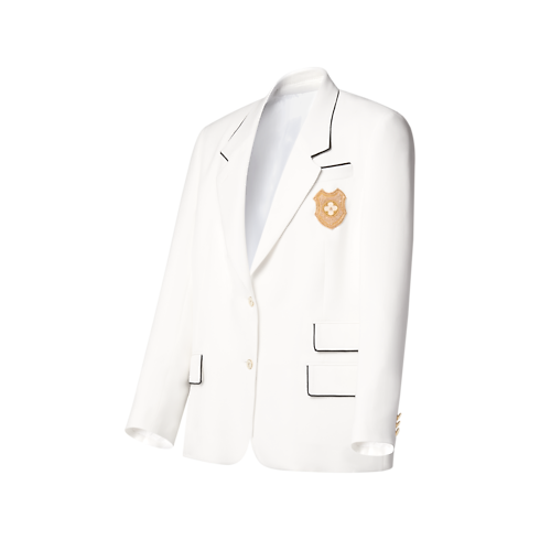 Preppy codes elevate this blazer with a fresh uniform feel. It is tailored in an oversized fit from silk crepe detailed with contrast trims around the notched lapels, two faux pockets and two functional flap pockets on each side. Golden LV buttons and an embroidered Monogram Flower crest patch underscore the smart, nautical style.