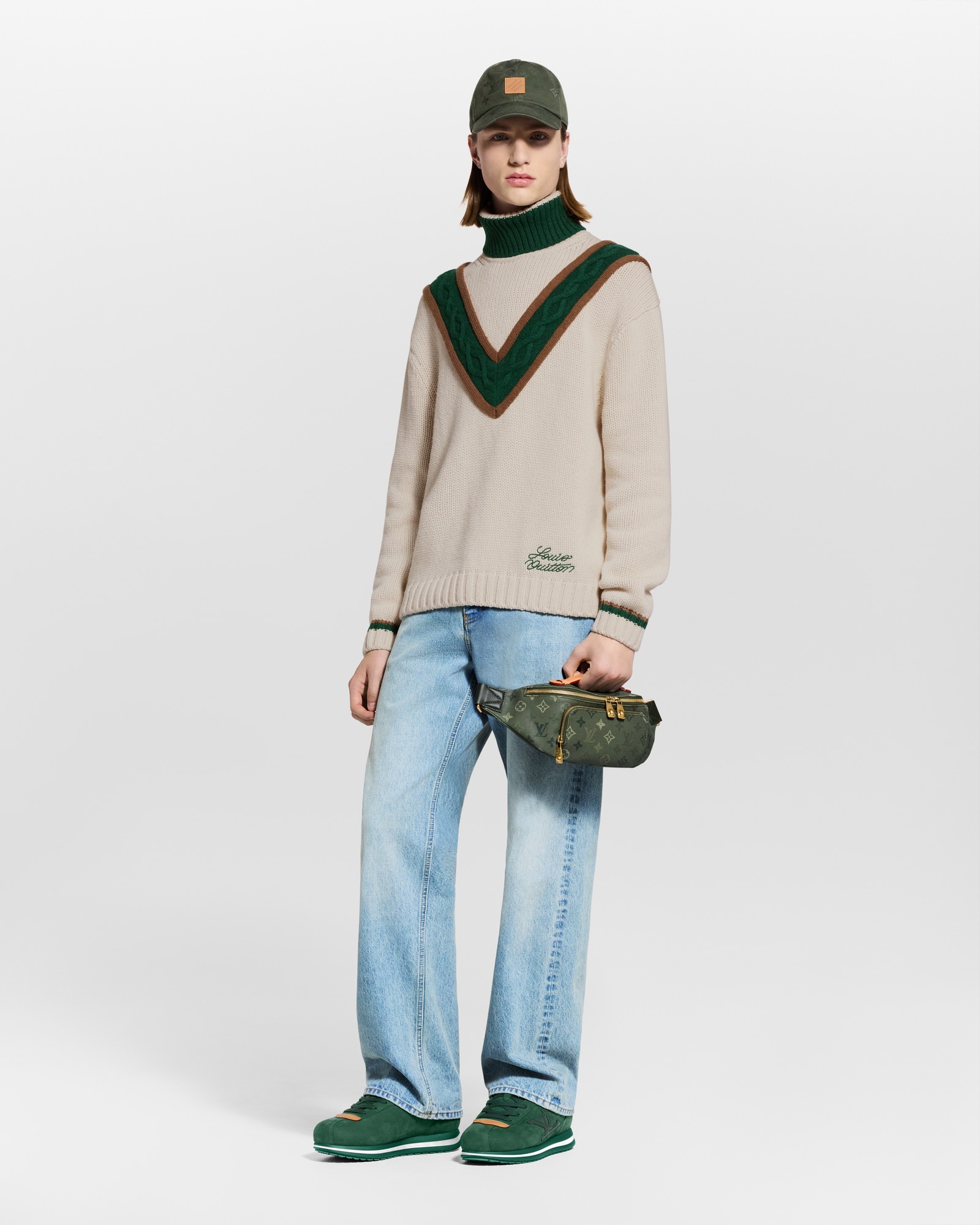 This preppy turtleneck draws on the sartorial codes of the British countryside. The pale beige chunky-knit wool is adorned with a 3D-effect cable-knit pattern in contrasting green in a bold ‘V’ across the torso. The same color continues on the turtle neck and the sporty ribbed cuffs, in addition to an elegant embroidered signature above the left hem.