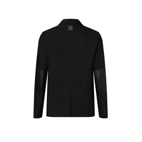 This black single-breasted jacket has an elegant silhouette twisted with utilitarian details. Crafted from technical cotton ripstop and unlined for summer ease, it has a zipper-edged lapel and black leather elbow patches. The breast pocket is adorned with an LV ornament, while a black leather Marque L.Vuitton Déposée patch signs the back. Pair with the matching cargo pants for an all black city look.