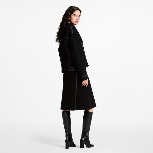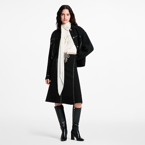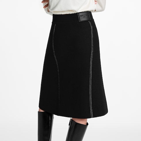 Trompe l’oeil detailing reworks this understated knit skirt with a playful denim effect. It is crafted from a soft, warm wool-cashmere blend in an unfussy flared silhouette trimmed with an elasticized ribbed waistband for a clean finish. Contrasting topstitching and golden rivets introduce a structured look, while a leather Louis Vuitton Paris patch subtly signs the back.