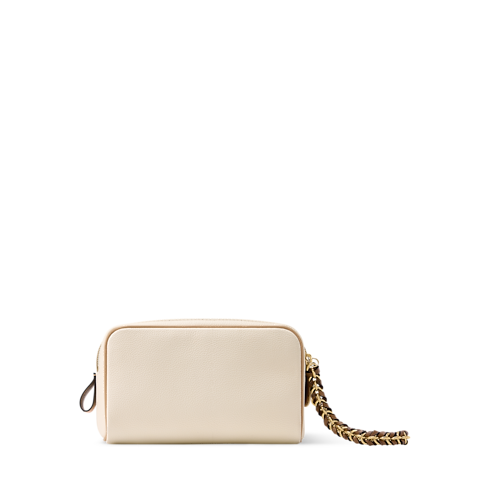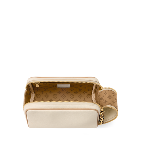 Creative Director Nicolas Ghesquière infuses feminine elegance into the Mini Dopp Kit, crafted from vanilla-toned calfskin and finished with a golden braided chain. A double-zip wide opening offers easy access to the Monogram-lined interior and its zipped pocket, while the chain transforms this functional piece into a chic hand-carry option.
