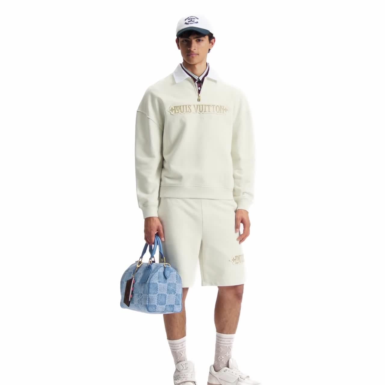 Perfect for relaxed days on board this collection’s cruise ship, this organic cotton sweatshirt in elegant cream tones has a white woven shirt collar and a contemporary half-zippered neckline. A textured Louis Vuitton patch adorns the chest while a discreet embroidered Louis Vuitton signature adorns the rear waist. Matching shorts make a laid-back set.