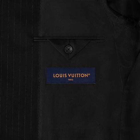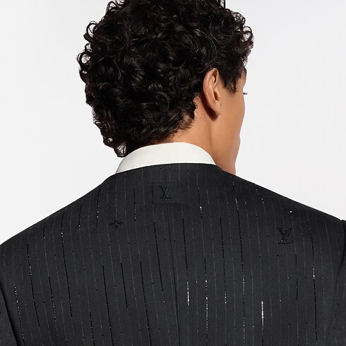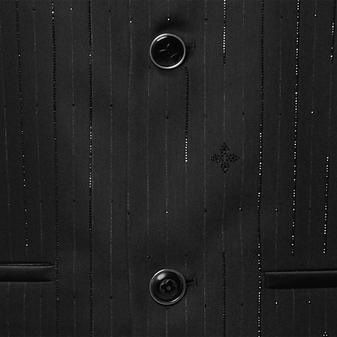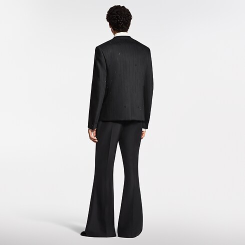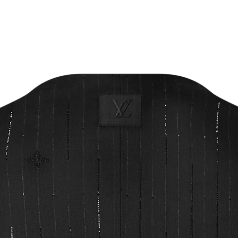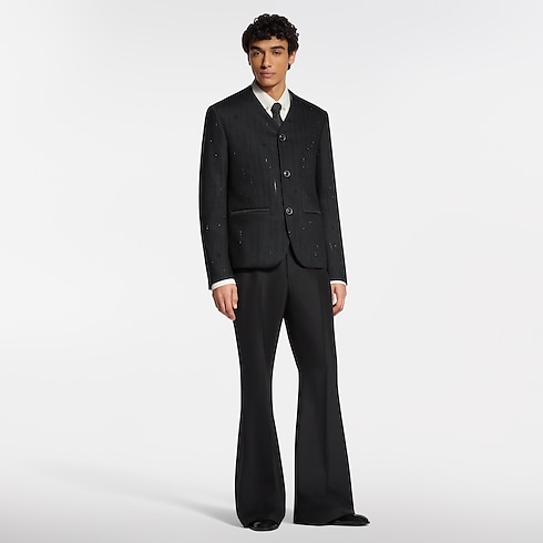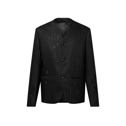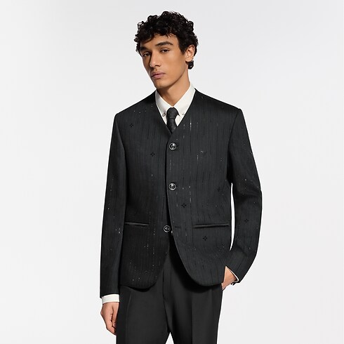 This distinctive black evening jacket draws on the iconic collarless style introduced by Pharrell Williams. The minimalist silhouette