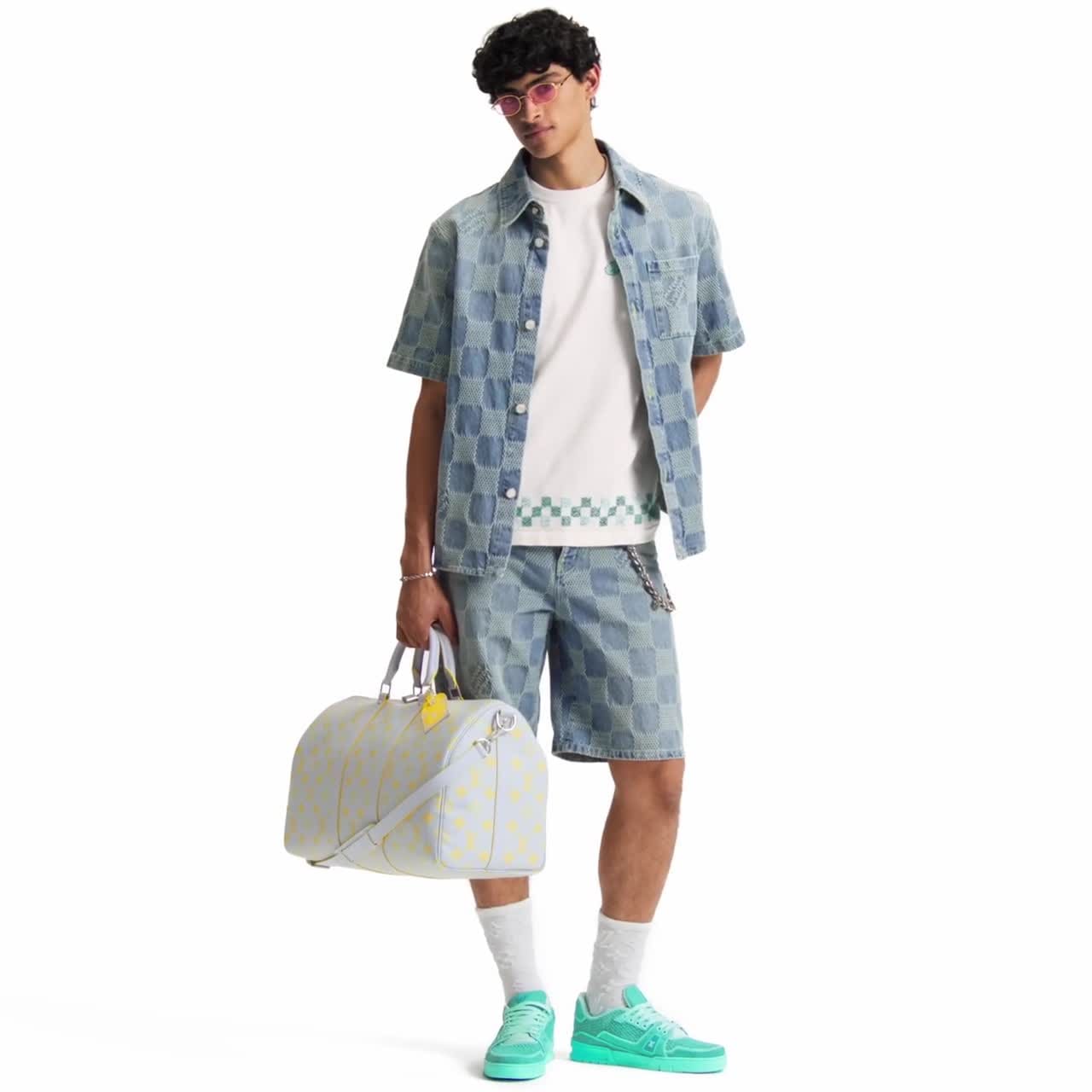 This short-sleeved crewneck in versatile milky white organic cotton is given a sophisticated twist with an embroidered beaded Damier motif along the bottom hem. The sparkling ornamentation is executed in a subtle range of aqua tones that recall swimming pool tiles. A beaded cursive LV adds further embellishment to the chest.