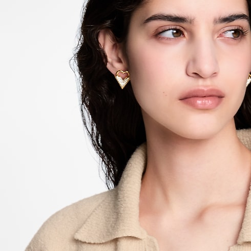 Inspired by the magic of love and affection, the Essential Love earrings combine eye-catching elegance with a subtle Louis Vuitton signature. Their striking design features a heart crafted in gold-toned metal, integrating the House’s distinctive V emblem enlivened with dazzling rhinestones. Easy to wear, these sophisticated earrings add a touch of romantic charm to any look.