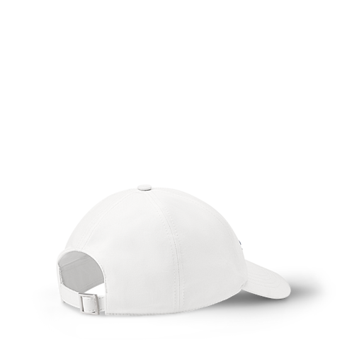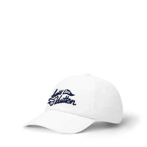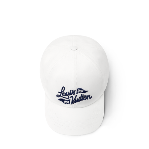 The bright white golf cap freshens up a day on the green. The signature, "Louis Vuitton Since 1854", is embroidered in an elegant script alongside triangle golf flags on the front panel in an intense blue. The back strap is equipped with a square buckle engraved with LOUIS VUITTON for customizable comfort and elegance.