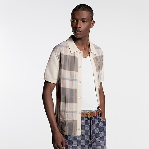 This short-sleeved shirt in a fine cotton knit is adorned in front with a plaid jacquard motif in the Spring-Summer 2026 show’s elegant beige tones. Signature elements are discreetly integrated into the motif, while a knitted polo shirt style collar and mother-of-pearl effect buttons further distinguish this refined take on everyday style.