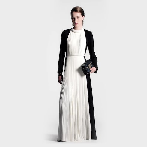 A graceful silhouette with a graphic twist: This long-sleeved dress is crafted in a sweeping floor-length cut from lightweight, fluid viscose jersey detailed with contrasting pleated accents that introduce sophisticated texture and showcase the House’s savoir-faire. A sculptural rolled neckline creates a trompe l’oeil jewelry effect, while an open back completes the look with an elegant finish.