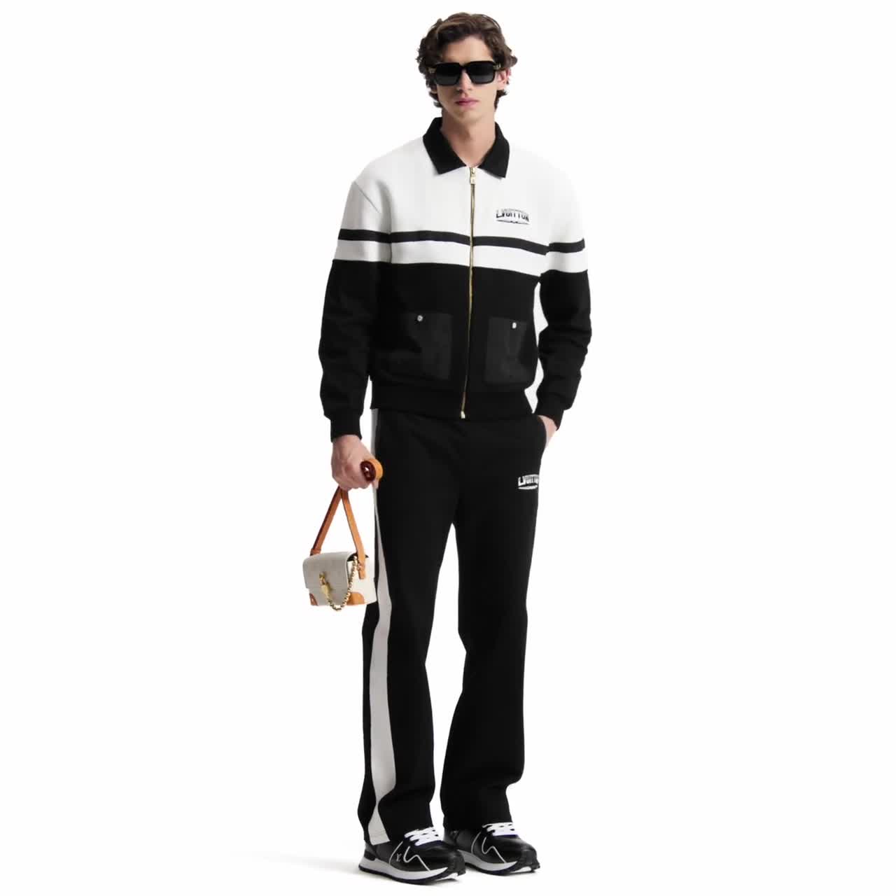 This hybrid zippered blouson with a crisp and sporty look is particularly suited for travel. Crafted from black cotton jersey, it is embellished with contrasting white cotton piqué inserts with a textured waffle-knit, while an embroidered L.Vuitton smartly signs the chest. This light and technical layer makes a smart set with matching pants.