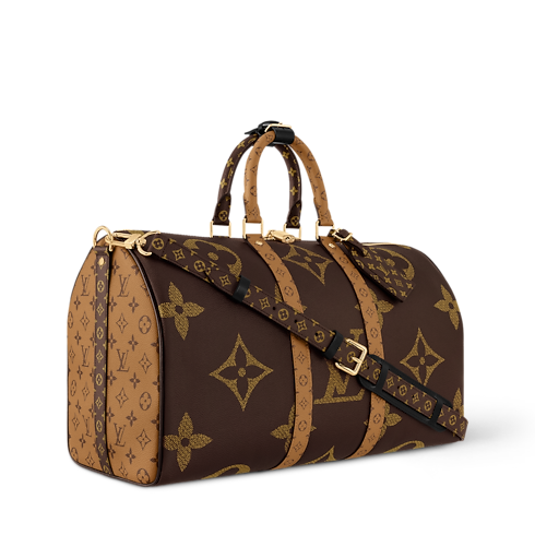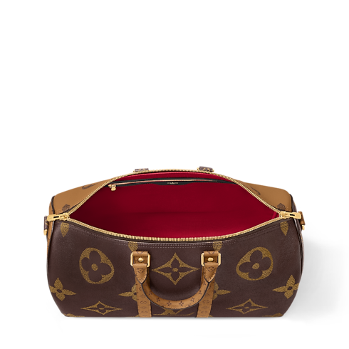Fashioned from Monogram Giant coated canvas with trim in Monogram Reverse, this Keepall Bandoulière 45 celebrates one of the House’s most emblematic patterns. Lined in sumptuous red textile, the interior boasts a zipped pocket. A removable and adjustable leather strap, in addition to two top handles, give carry options.