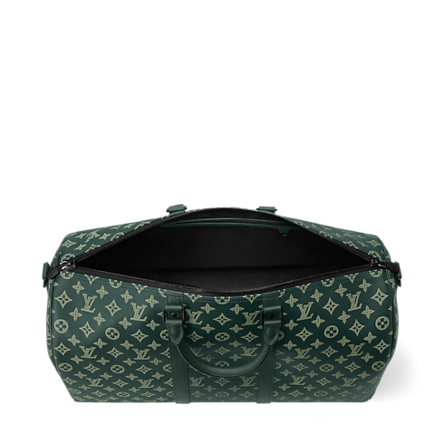 The Keepall Bandoulière 50 is made from Monogram Shadow calf leather in a natural green colroway. The Monogram is embossed into the supple leather and also printed on it in lighter hue. Sized for carry-on use, it features an inside zipped pocket and a removable and ajustable shoulder strap, in the same black as the hardware.