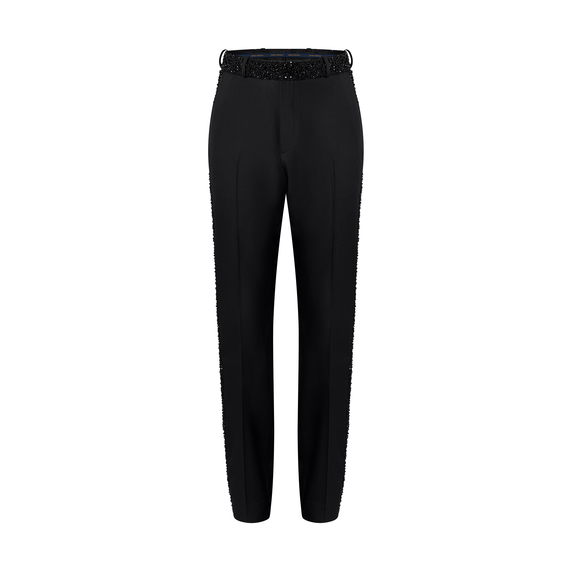 Pharrell Williams crafts the Keepall Cargo Bandoulière 25 from shiny black calfskin for a city bag with an understated elegance that incarnates Williams’ dandy aesthetic. The main zipper features a zip-pull connected to an LV Initials charm. The bag is signed with a “Louis Vuitton Paris patch” attached to the leather with two pearl rivets.