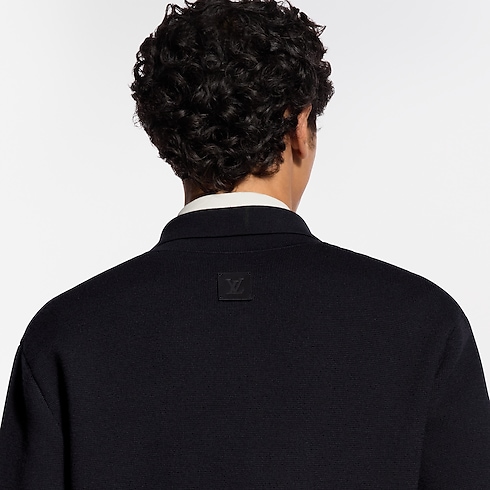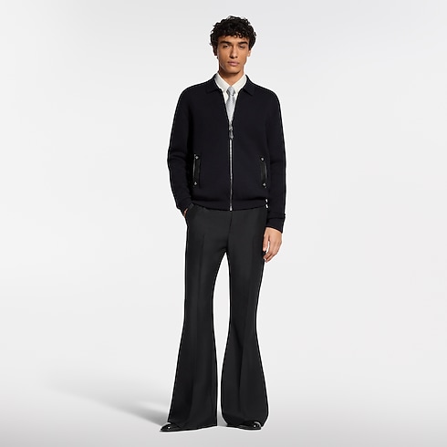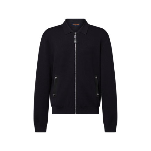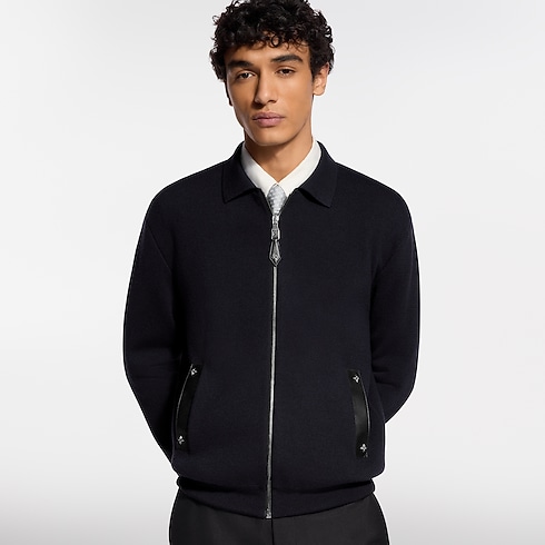 This blue-black knitted wool blouson is a contemporary yet timeless piece. It is accented with tone-on-tone leather details