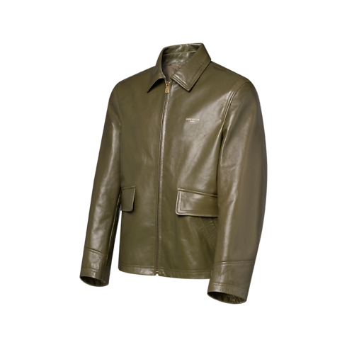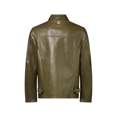 This smooth and lustrous calfskin jacket from the Spring-Summer 2026 runway comes in an elegant, muted green. Gold-stamped Louis Vuitton Paris lettering embellishes the chest, while a gold-toned metal ornament signs the back. The contemporary silhouette has a boxy fit with adjustable waist tabs and a zipper fastening, making it perfect for transeasonal layered looks.