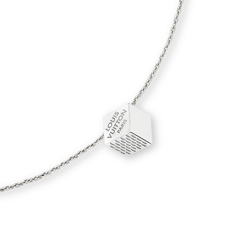 The playful elegance of the sterling silver LV Cube necklace echoes the spirit of Pateki, a puzzle game designed by Gaston Vuitton in 1932. Its cube-shaped centerpiece is adorned with engraving inspired by the iconic Damier canvas, complete with the Louis Vuitton Paris signature. An eye-catching, easy-to-wear necklace, ideal for everyday and more formal occasions.