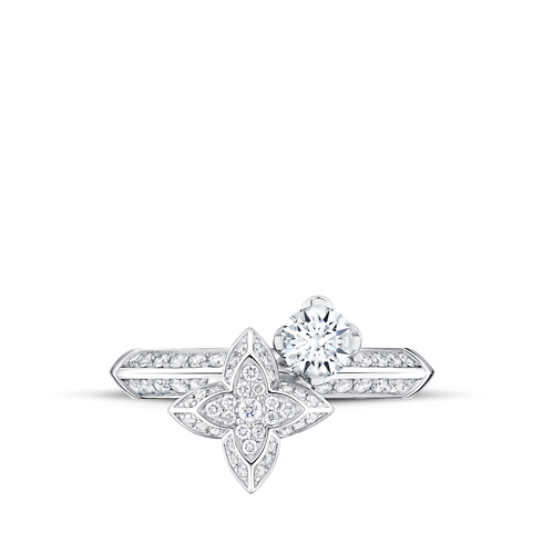 The LV Diamonds double ring, round brilliant cut, showcases the Maison’s exceptional jewellery savoir-faire. Cast from 18-karat white gold, the ring is centered with an LV Monogram Star set with pavé diamonds highlighting the round brilliant-cut center stone. For a distinctive signature touch, the center stone basket is modeled after the stylized flowers of Louis Vuitton’s legendary Monogram pattern, while brilliant diamonds on the band add a final touch of light. Playful and easy to mix and match, this ring makes a memorable gift to be cherished forever.