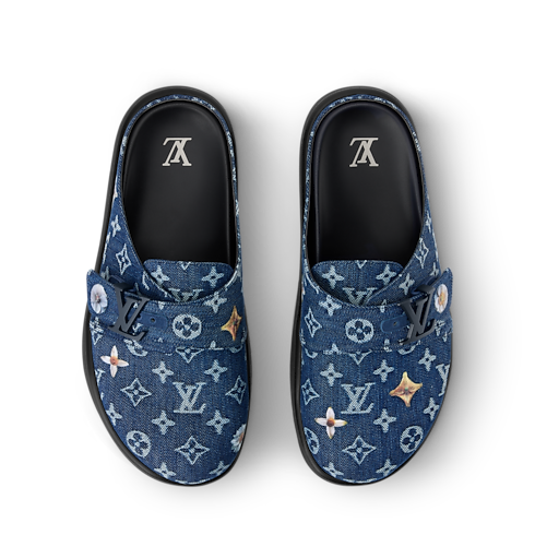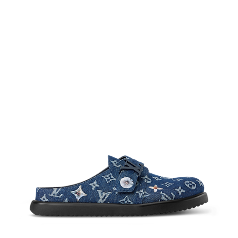 The LV Easy mule in Monogram denim is embellished with embroidered flowers for a look that is simultaneously relaxed and refined. This easy, slip-on style is signed with a tonal LV Initials buckle on its adjustable strap. It is finished with a comfortable anatomic footbed and a lightweight rubber outsole.