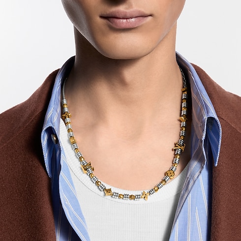 The LV Eternal Beads necklace is a glamorous style that exudes warmth. An adjustable strand of silver-toned links hosts a sequence of gold-toned LV Initials and Monogram Flowers, alongside a stylish mix of graphic beads. Its appeal lies in the variety of shapes and cohesive blend of metallic hues.