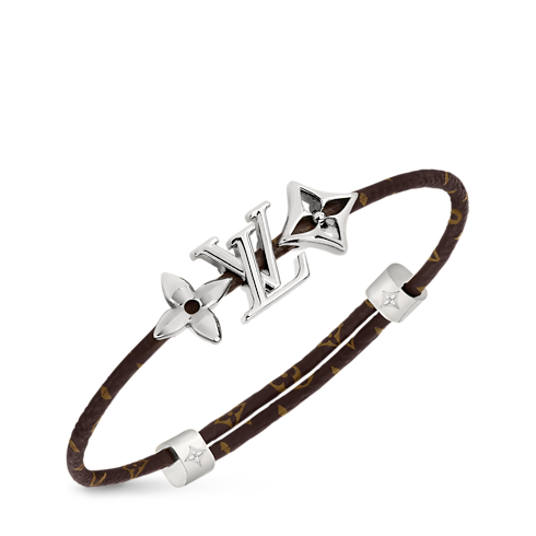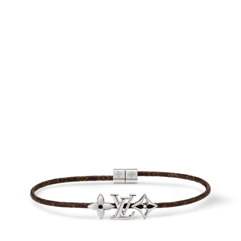 The LV Iconic leather bracelet offers a casual but sophisticated way to wear the Louis Vuitton signature. Styled in Monogram leather, it showcases a trio of House emblems: the LV Initials surrounded by two different Monogram Flowers, all in lustrous silver-colored metal. And it’s fully adjustable to ensure a perfect fit on every wrist.