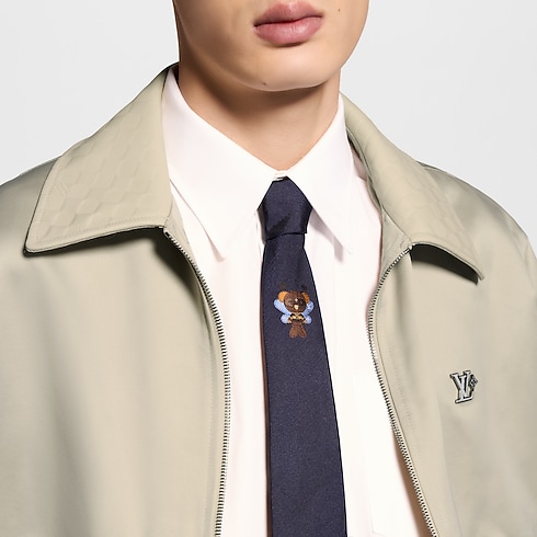 The LV Louis Bear Bee tie is a navy silk style with a singular, playful addition. Once simply a cozy bedtime companion, the House figure returns with blue wings, embellished with the Monogram in white, antennae, and striped attire. This is a personality-filled accessory for a true enthusiast of the House.