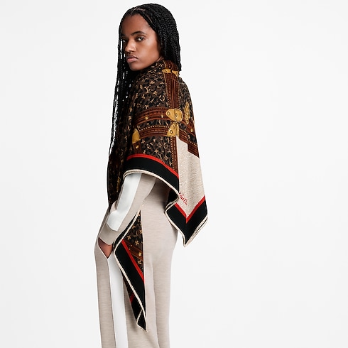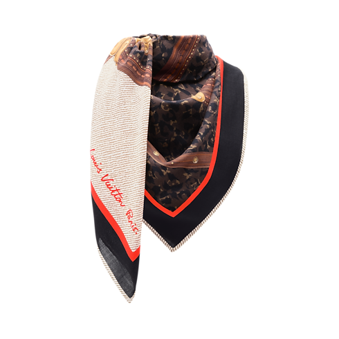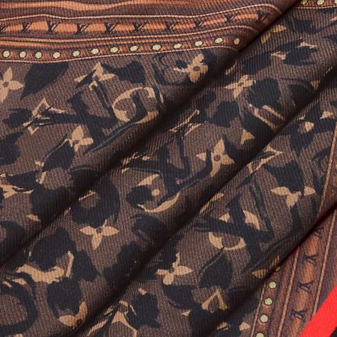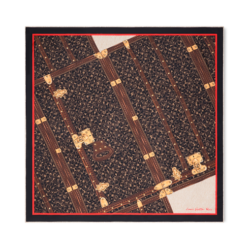 The creative, on-trend design of the LV Safari Trunk shawl is a dual tribute to the House’s heritage. Crafted in a plush wool-silk blend, it depicts a finely detailed vintage trunk adorned with the historic Monogram pattern reinterpreted as an exotic leopard print. A red stripe border recalling the iconic Alma handbag adds an extra signature flourish.