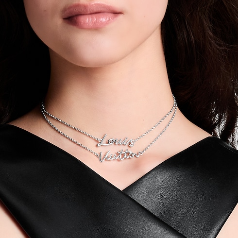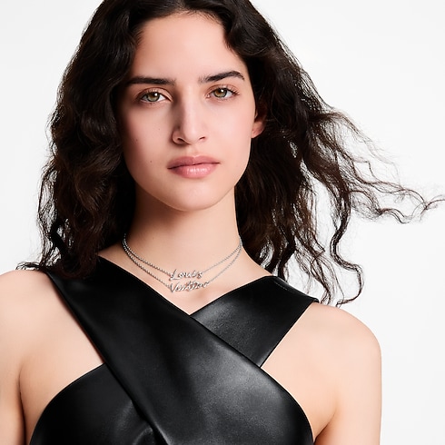 The eye-catching LV Script necklace features a House signature first seen as the backdrop for the Spring-Summer 2025 runway show. Suspended from strands of palladium-colored chain links, its double pendant spells out the name Louis Vuitton in a sleek hand-written style. Ideal for special occasions, it also adds a touch of on-trend chic to an everyday look.