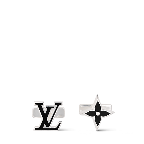 The LV Spike cufflinks add polish and mood in equal measure to business attire or formal occasions. One style is a Monogram Flower, the other a pair of LV Initials. The signatures are decorated with black enamel against sterling silver, creating a modern combination of materials that feels timeless.