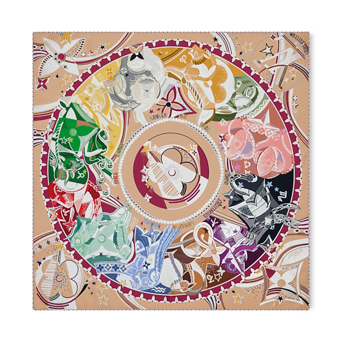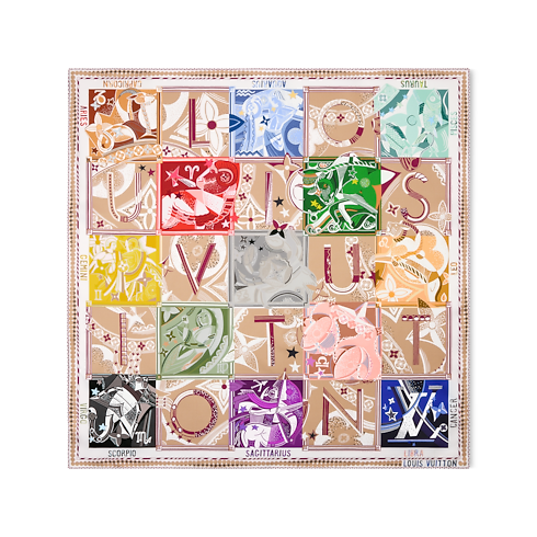 Inspired by the mystique and symbolism of the zodiac, the all-silk LV Star Sign square emanates celestial chic. Its colorful, creative pattern incorporates all 12 astrological signs, mixed with Monogram Flower motifs and letters spelling out Louis Vuitton for a subtle, distinctive signature. Perfect for bringing a touch of cosmic sophistication to an everyday or formal outfit.