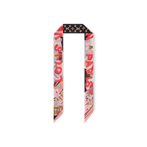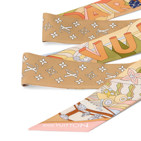 The all-silk LV Wonderland BB bandeau is a colorful ode to creativity and craftsmanship. Its eye-catching pattern depicts a whimsical futuristic landscape accented with Monogram Flowers and iconic Louis Vuitton luggage creations. Outsized letters with a striking 3D effect spell out the House’s name, adding an original signature to this elegant contemporary accessory.