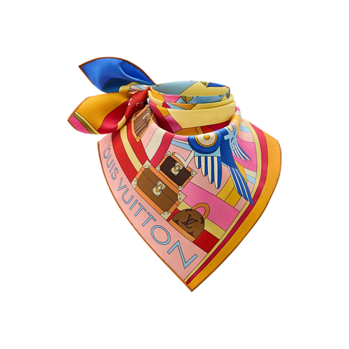 The all-silk LV Wonderland square offers a striking combination of contemporary artistic vision and timeless heritage touches. Its imaginative design features the famous LV Initials surrounded by historic Louis Vuitton trunks and bags, bouquets of Monogram Flowers and whimsical mechanical birds. The entire pattern is tilted in the colorful border for a dynamic, futuristic effect.