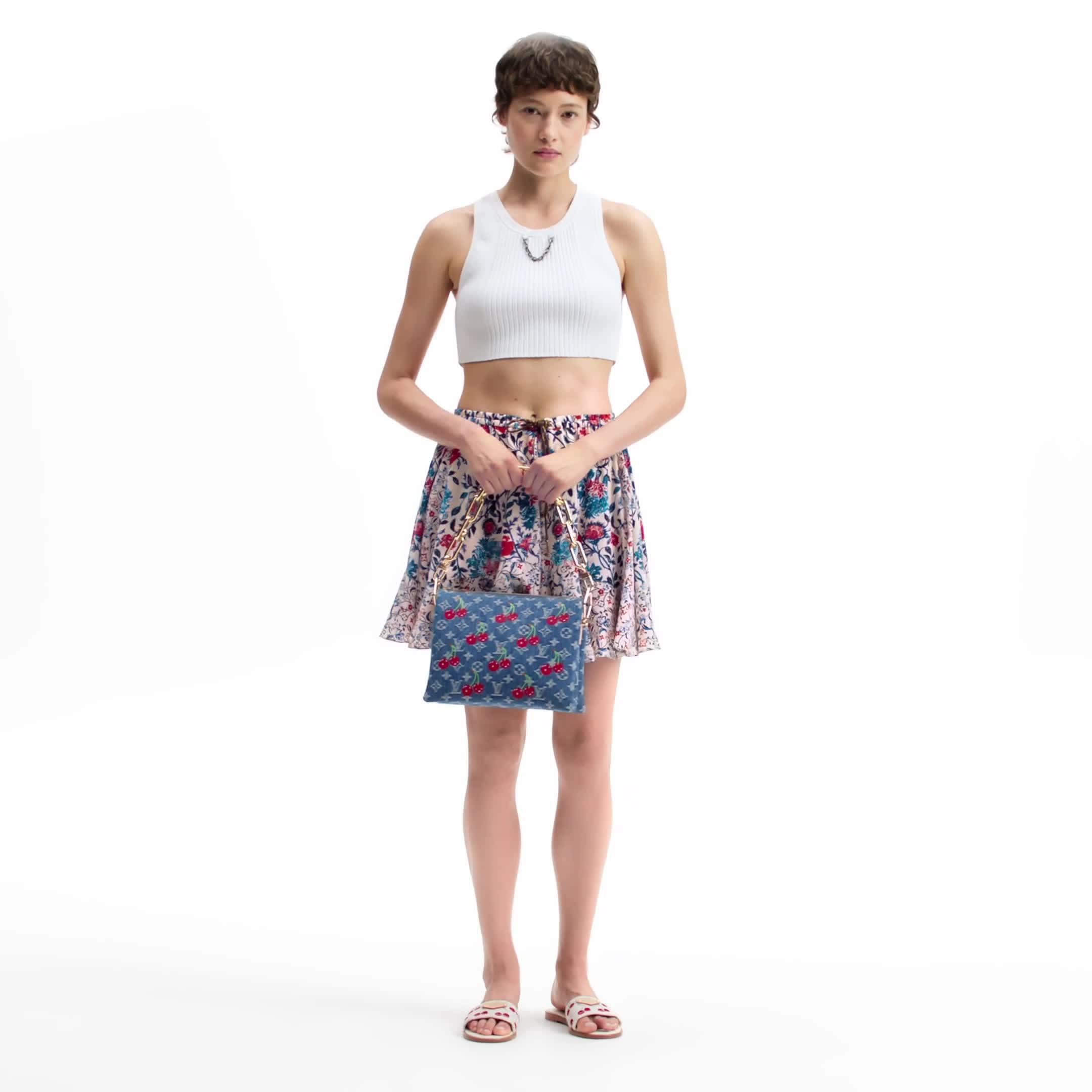 As part of the re-edition of the exuberant Louis Vuitton x Murakami collection, the iconic Coussin PM is playfully refreshed in Monogram denim embellished with embroidered cherry motifs in the Japanese artist’s signature bold, joyful style. Complete with a removable golden chain and an adjustable leather strap, the inside fits daily essentials including a large smartphone.