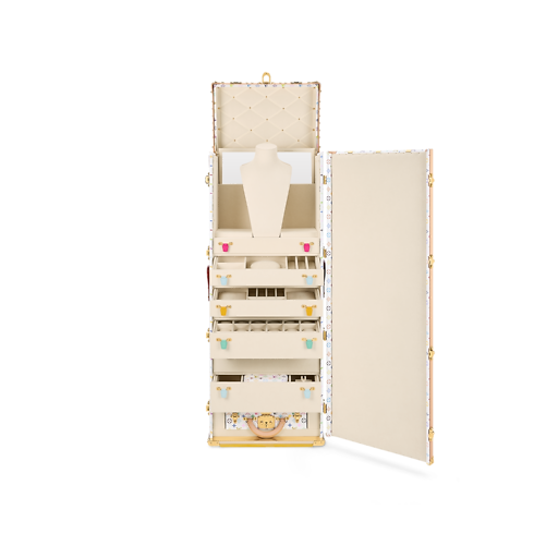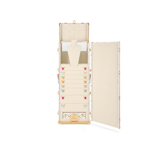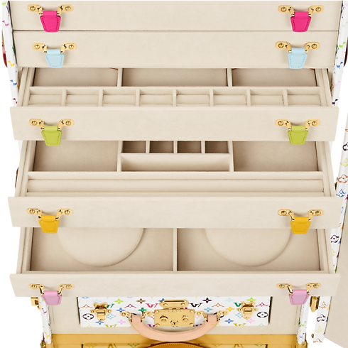 Ideal for storing, transporting, and displaying high jewelry, the luxurious Malle Vendôme takes on a joyfully modern feel in Takashi Murakami’s Monogram Multicolore canvas. Lined in microfiber and quilted on the lid, its sumptuous interior features a necklace bust, drawers, display cases, a mirror, a nomadic pouch, and a Boîte Bijoux that slides out for separate use.