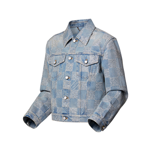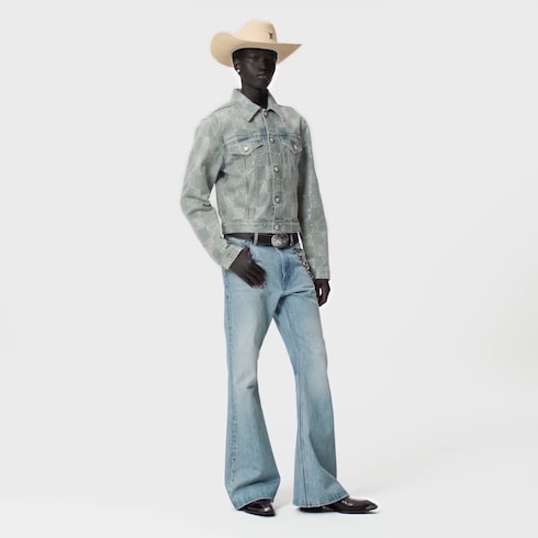 This Made to Order denim jacket offers a sparkling take on the FW24 Show’s dandy Western-inspired looks. The classic silhouette is crafted with a washed Damier jacquard and elevated with meticulously applied crystals all over. ‘Marque L.Vuitton déposée’ signatures and pearl-effect buttons add a sophisticated final touch to this standout day-to-evening piece.