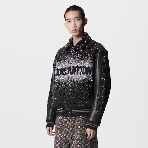 This Made to Order varsity blouson from the FW23 Show is encrusted with hand-embroidered crystals and beads. Crafted from black wool and leather, this piece features Louis Vuitton signatures and Show slogans on the chest, back and arms, making this piece truly exceptional.