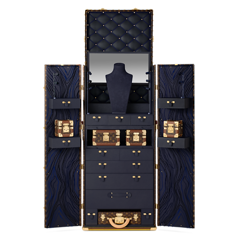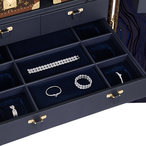 The Malle Haute Joaillerie, with its luxurious material (velvet, satin, cowhide) is the perfect casket to highlight high jewelry pieces. Very exceptional with its two drawers opening, the Malle Haute Joaillerie is also the very first trunk to offer a lighting system to showcase high jewelry pieces.