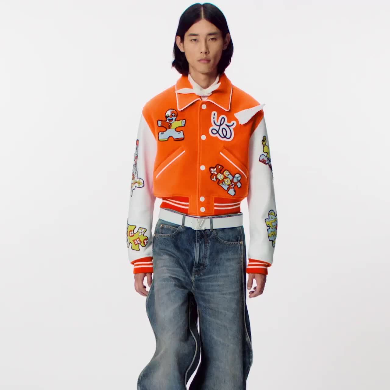 This varsity blouson stands out with its relaxed cropped silhouette and playful embroideries on the bright orange wool body and white leather sleeves. An embroidered LV signature on the left chest and a hand-made Louis Vuitton rainbow crochet patch across the back complete this richly detailed piece.