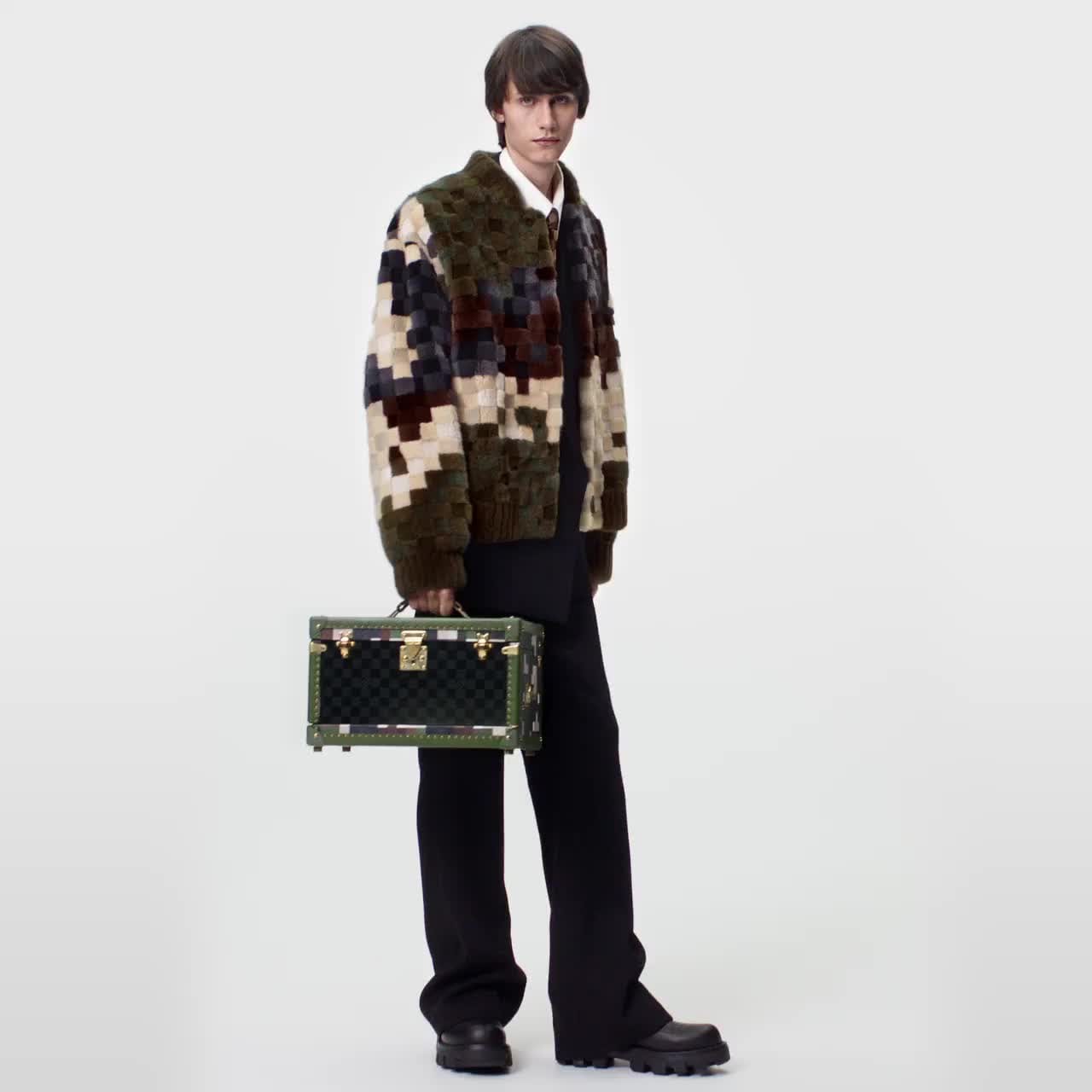 This exclusive mink blouson offers a luxurious twist on the SS24 Show’s iconic Damoflage. The soft, deep fur is intricately cut and reassembled in a graphic pixelated motif, whose subtle camouflage tones incorporate an LV on the chest. This silk-lined piece is finished with a ribbed and elasticated bottom hem and cuffs, also in fur.