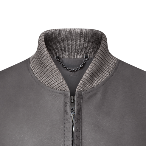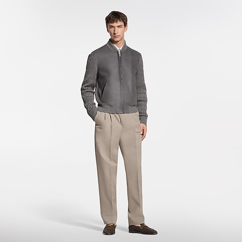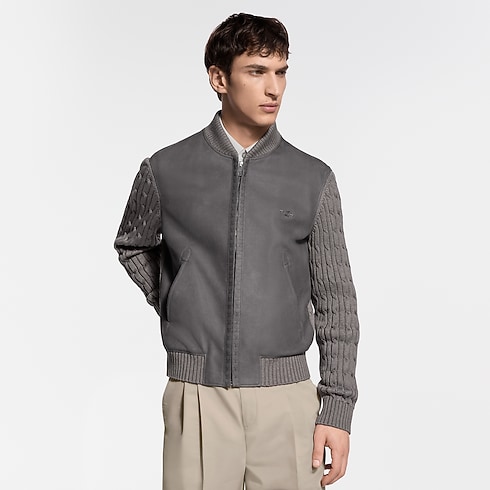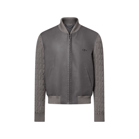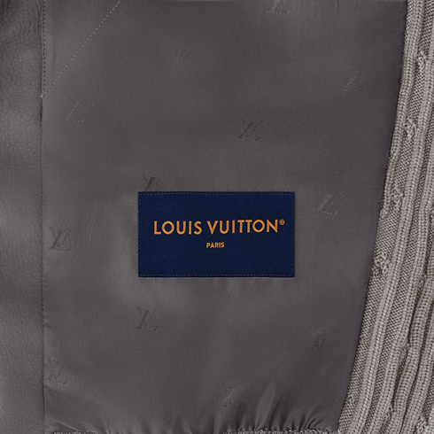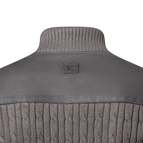 This elegant taupe blouson is a versatile mid-season outer layer. It combines soft-grained matte leather on the front body and rear yoke with a lustrous silk-blend cable knit on the sleeves and back. Signature accents include a metal LV detail on the chest and LV Lozine-inspired leather bands along the zipper recalling the House’s leather goods heritage.